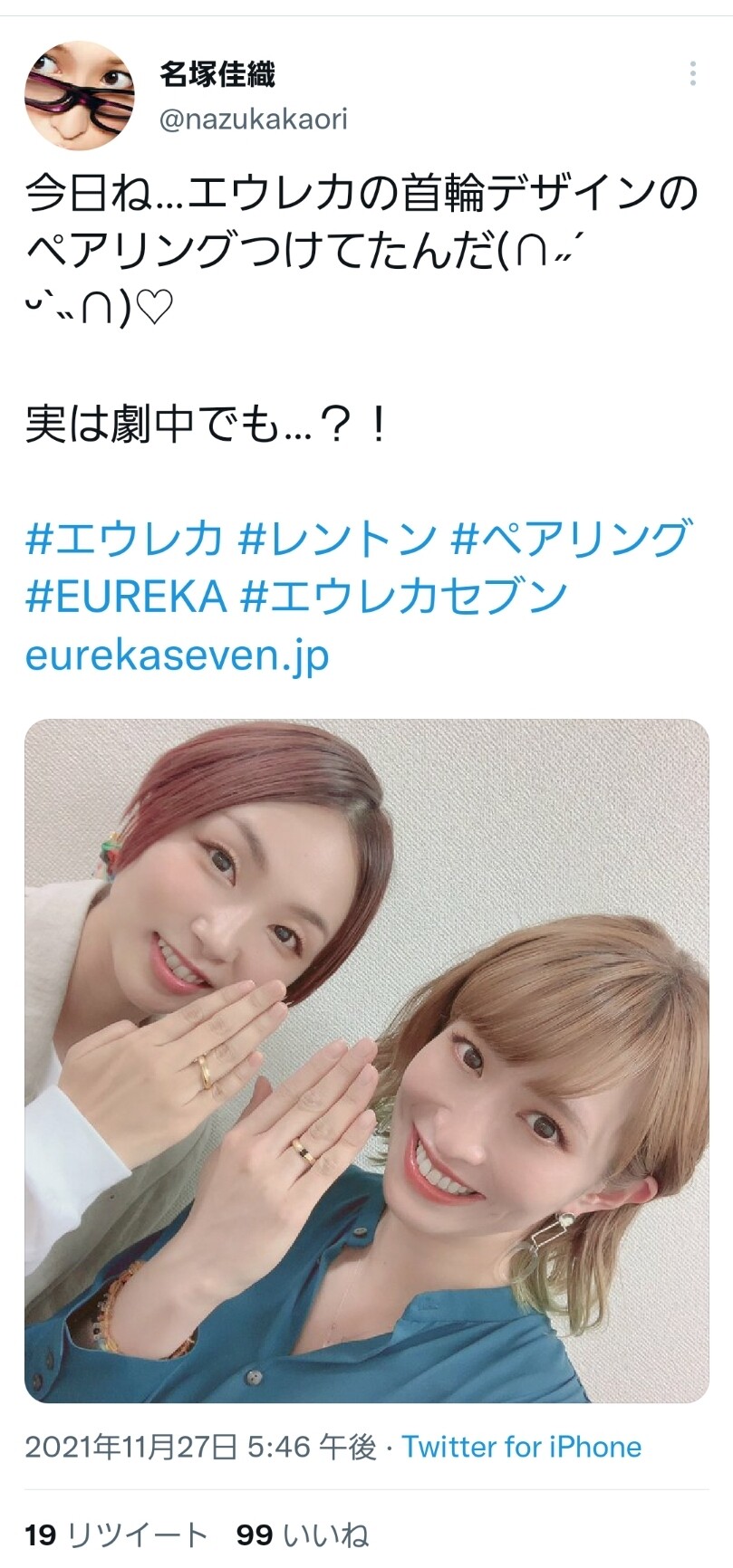 舞台挨拶でもつけていたエウレカのペアリング気付きました?私のが少し大きくて向き変わってしまい違う指輪に見えちゃうかな… https://t.co/9RzyDmFKP52021/11/27 17:19:46