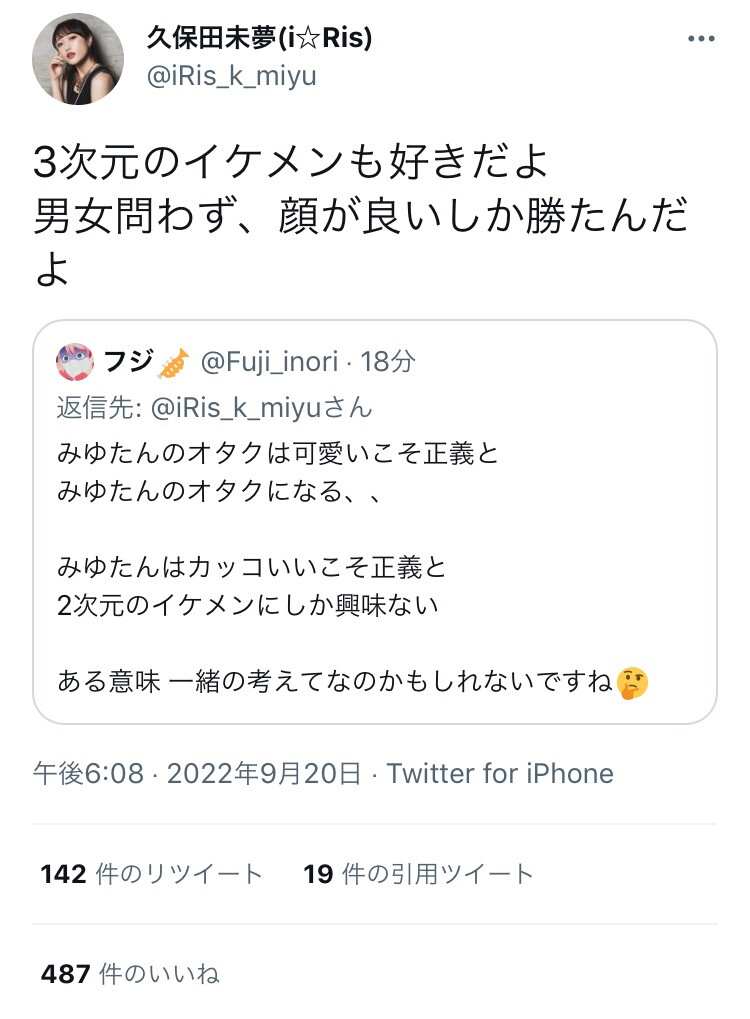 久保田未夢(i☆Ris)@iRis_k_miyu3次元のイケメンも好きだよ