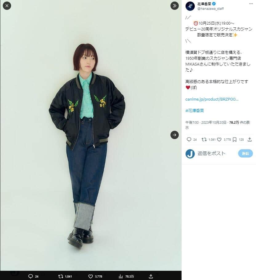花澤さんは2023年10月20日、公式X(ツイッター)を通じ、デビュー20周年を記念して「オリジナルスカジャン」を数量限定で販売するとアナウンスした。