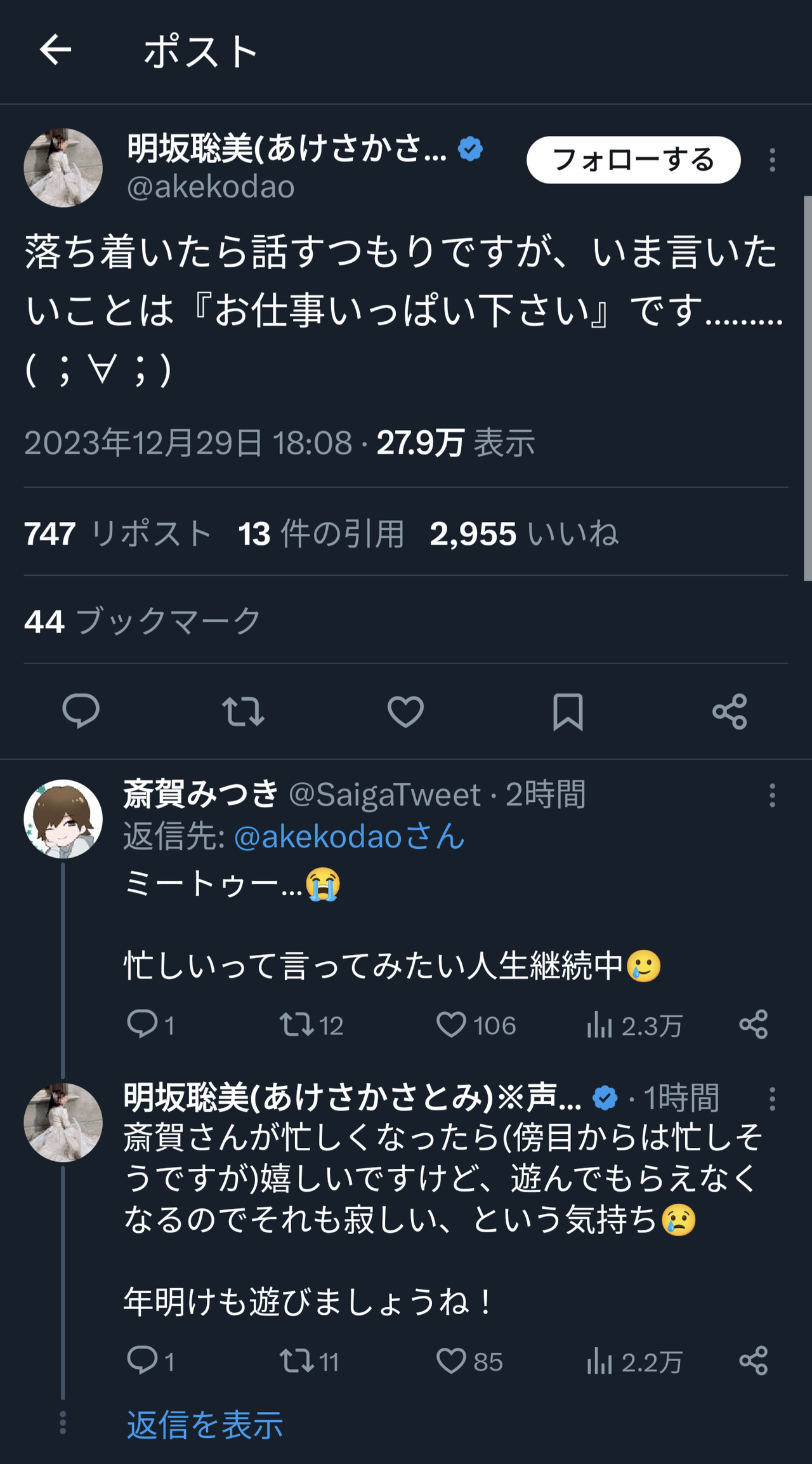 忙しいって言ってみたい人生継続中🥲— 斎賀みつき (@SaigaTweet) December 29, 2023