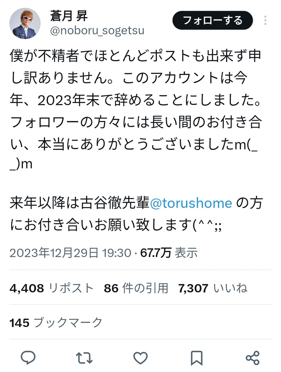 来年以降は古谷徹先輩@torushome の方にお付き合いお願い致します(^^;;— 蒼月 昇 (@noboru_sogetsu) December 29, 2023
