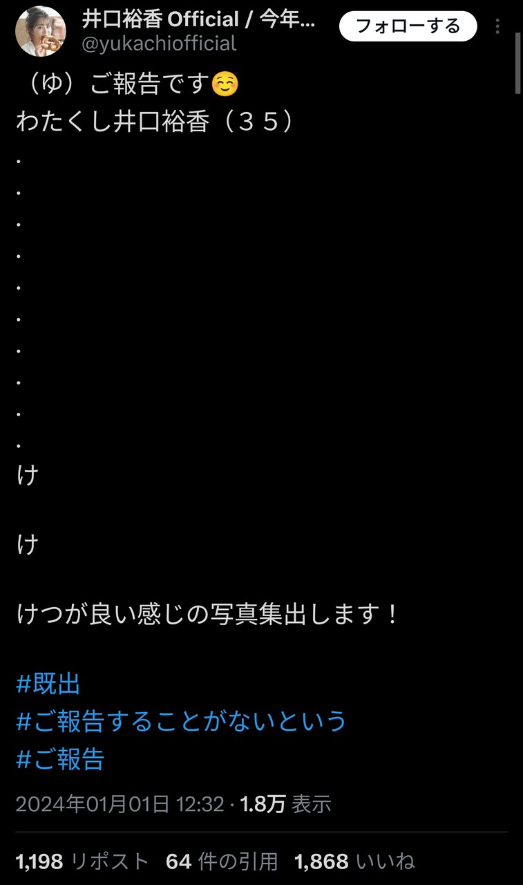 けつが良い感じの写真集出します!#既出#ご報告することがないという#ご報告— 井口裕香 Official / 今年の夏は2ndミニアルバム💛 (@yukachiofficial) January 1, 2024