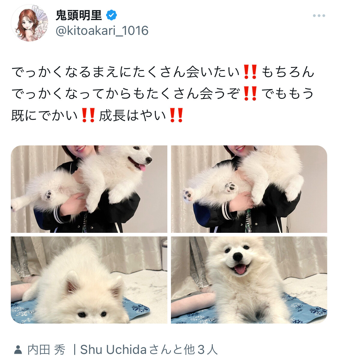 でっかくなるまえにたくさん会いたい‼️もちろんでっかくなってからもたくさん会うぞ‼️でももう既にでかい‼️成長はやい‼️ pic.twitter.com/G6JZ0Q6RkY— 鬼頭明里 (@kitoakari_1016) April 1, 2024