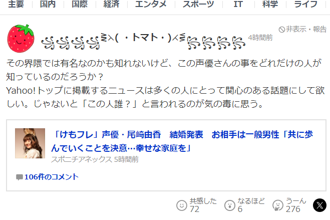 芸能カテゴリーに乗り込んでいって文句を言ってるのは謎のヤフコメ民