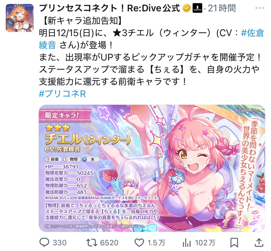 ステータスアップで溜まる【ちぇる】を、自身の火力や支援能力に還元する前衛キャラです!#プリコネR pic.twitter.com/tTTjHdi5ak— プリンセスコネクト!Re:Dive公式 (@priconne_redive) December 14, 2024