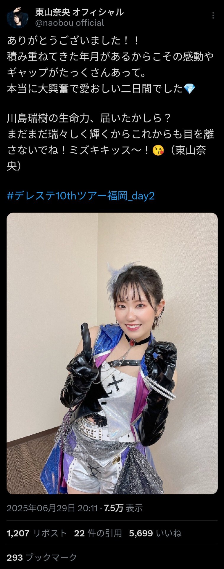 まだまだ瑞々しく輝くからこれからも目を離さないでね!ミズキキッス~!😘(東山奈央)#デレステ10thツアー福岡_day2 pic.twitter.com/oLxJkfTaEp— 東山奈央 オフィシャル (@naobou_official) June 29, 2025
