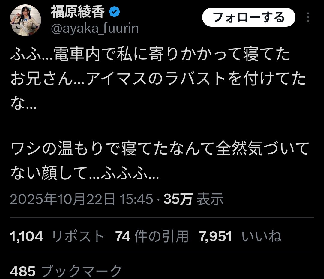 ワシの温もりで寝てたなんて全然気づいてない顔して…ふふふ…— 福原綾香 (@ayaka_fuurin) October 22, 2025