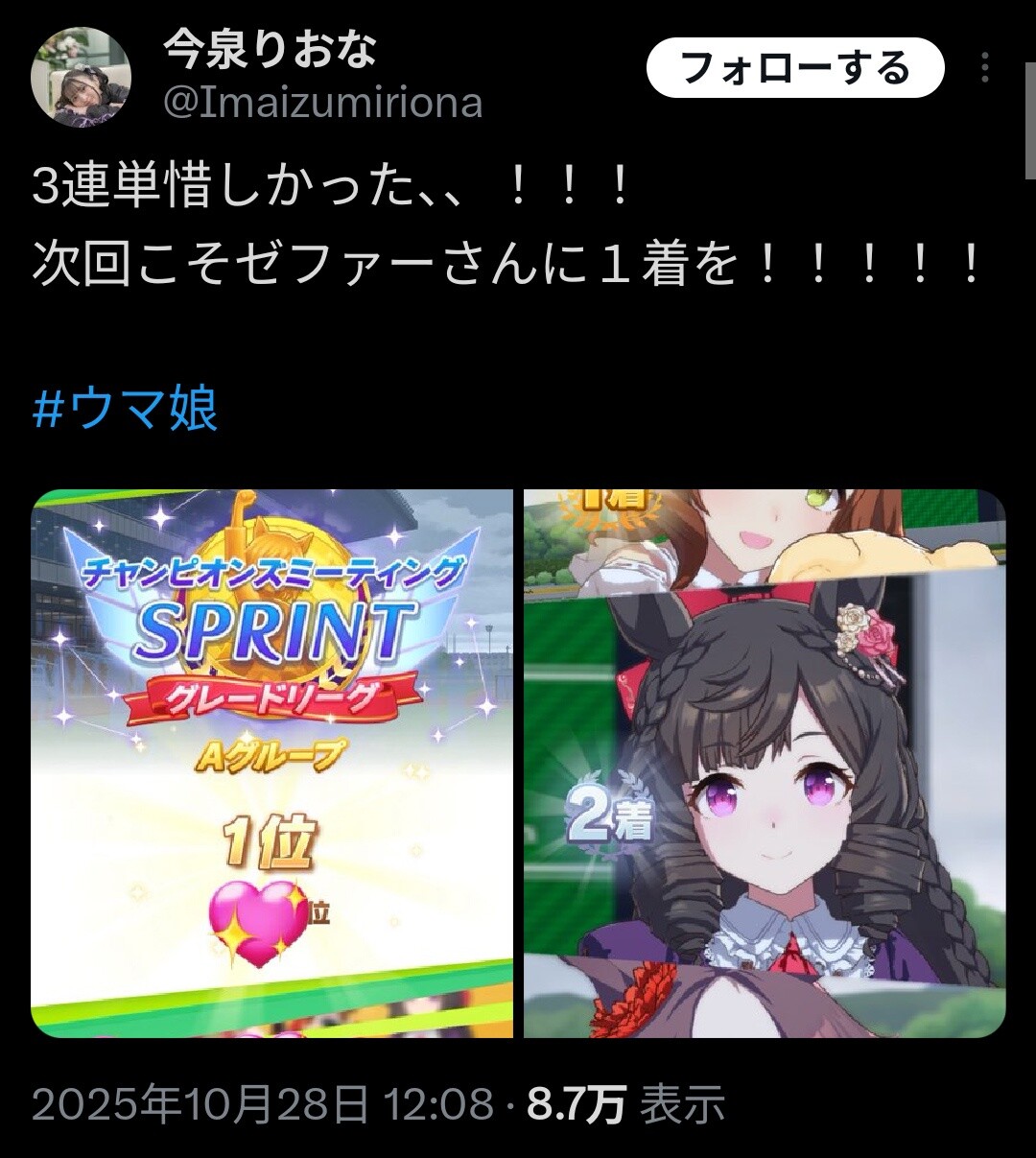 次回こそゼファーさんに1着を!!!!!#ウマ娘 pic.twitter.com/32OqtsEKex— 今泉りおな (@Imaizumiriona) October 28, 2025