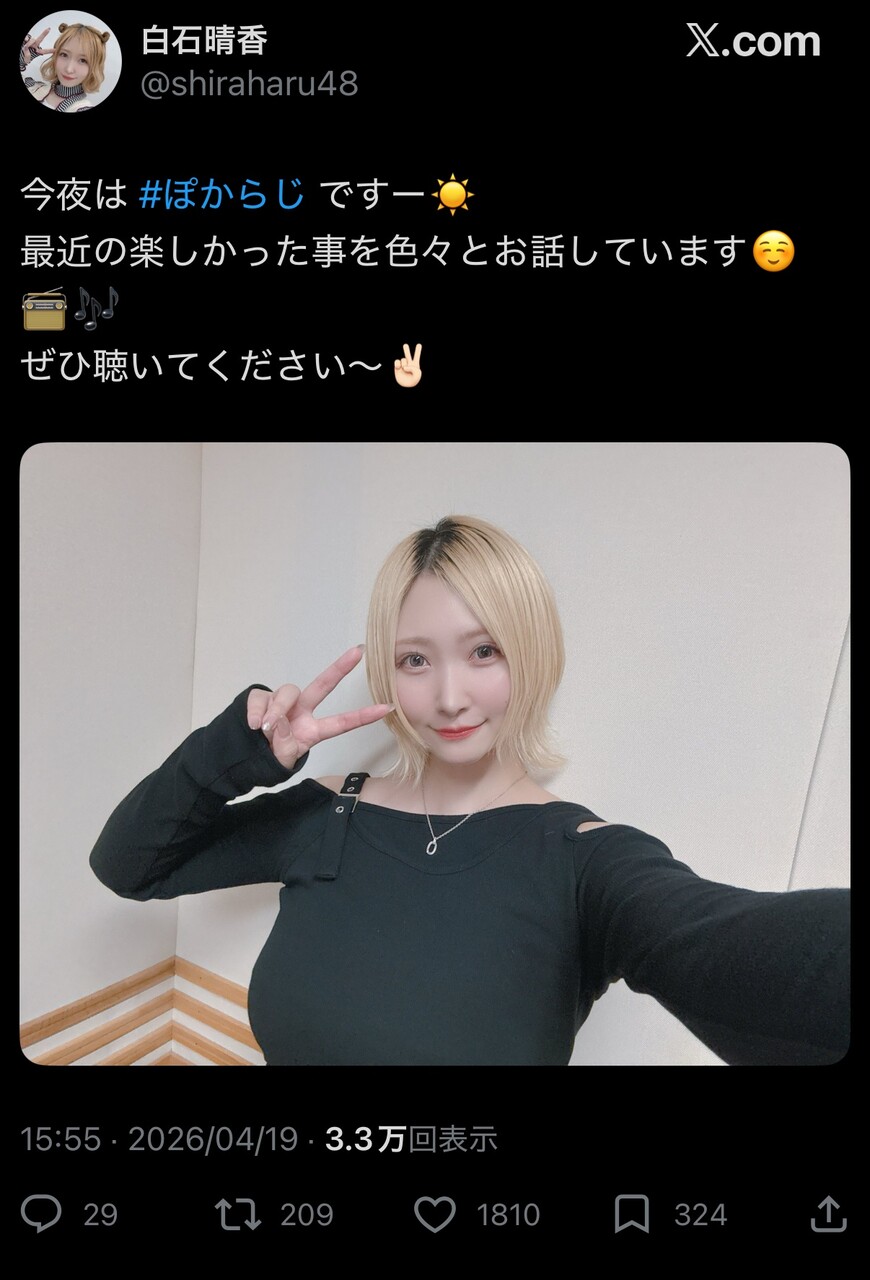 ぜひ聴いてください〜✌🏻 pic.twitter.com/OPkg9R5ZF2— 白石晴香 (@shiraharu48) April 19, 2026