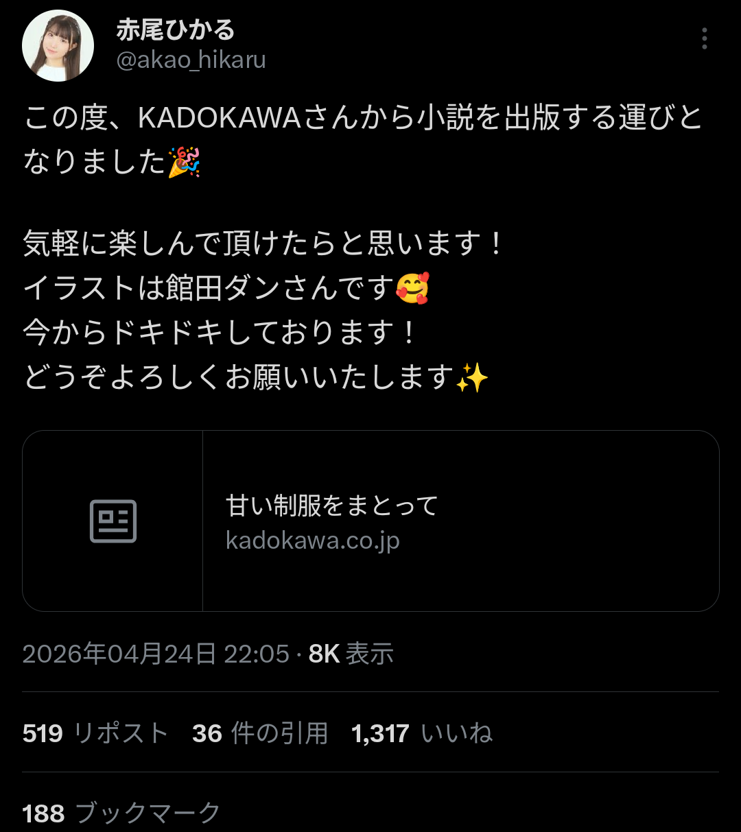 どうぞよろしくお願いいたします✨https://t.co/zn8MlgWqm8— 赤尾ひかる (@akao_hikaru) April 24, 2026