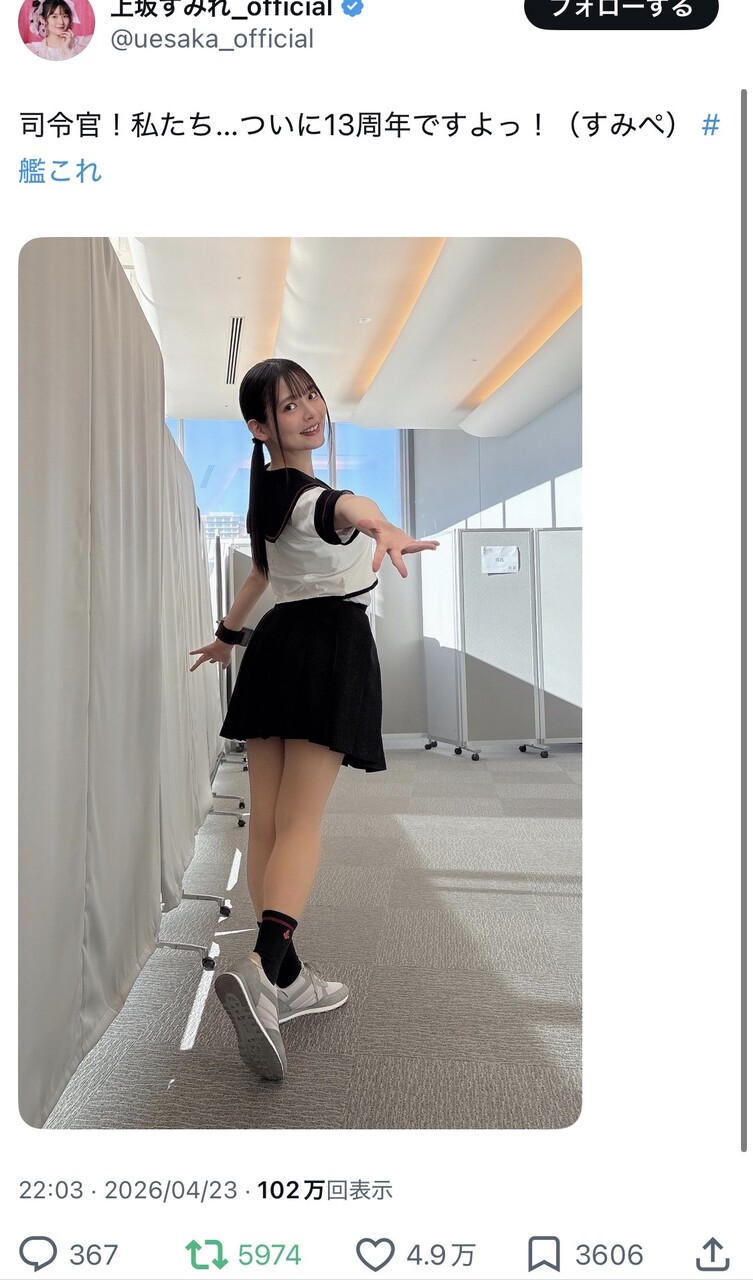 司令官!私たち…ついに13周年ですよっ!(すみぺ) #艦これ pic.twitter.com/rGckLS9rYK— 上坂すみれ_official (@uesaka_official) April 23, 2026