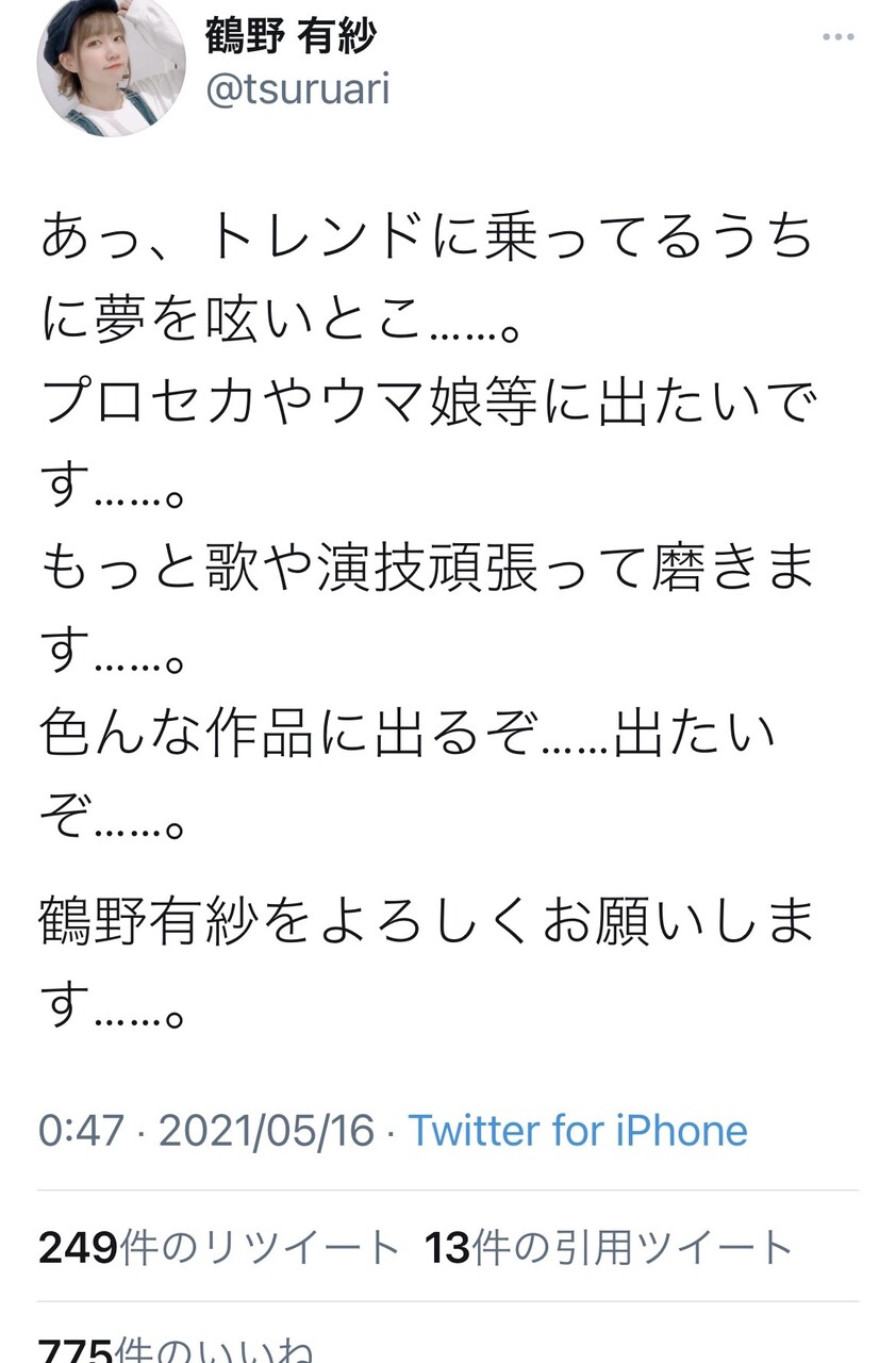 鶴野有紗をよろしくお願いします……。2021/05/16 00:47:26